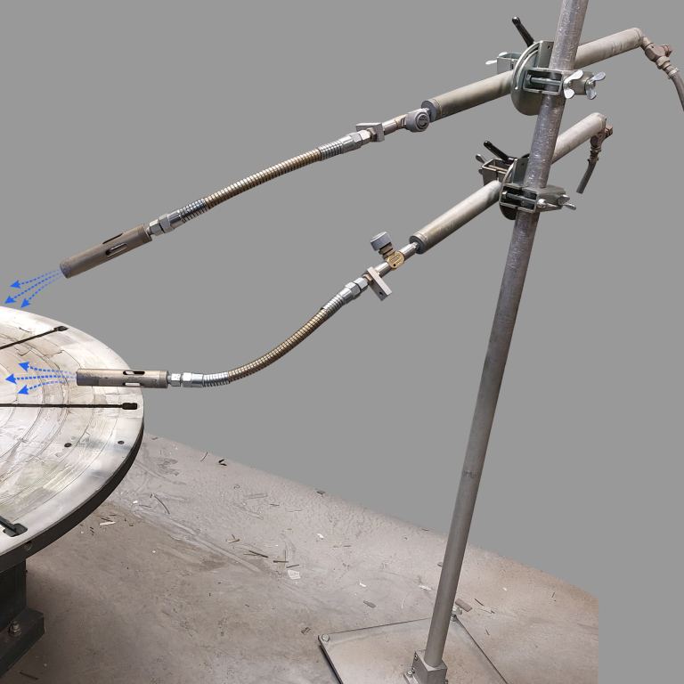 For small parts, robot programming offers an additional advantage: robots can activate or deactivate the powder feed and part coolers as needed. In some cases, cooling a small spray area with air venturis risks disturbing the powder in the flame (spray plume). Robot programming allows you to activate specific coolers only when the gun is outside a critical area, ensuring the part is cooled without affecting the coating plume.