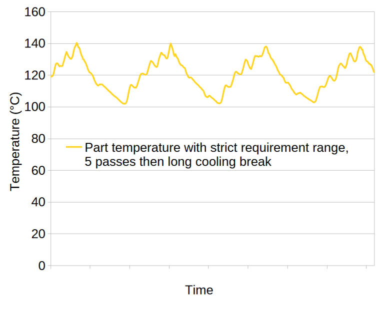 For greater control, program your equipment, often a 6-axis robot, to include periodic breaks. For example, after every 5 passes, the robot can move to a standby position, pause the powder feed (to limit cost), and wait for a set duration before the next pass. These breaks help maintain the part temperature within a defined range and prevent it from exceeding a maximum threshold. The frequency and duration of these breaks should be determined through testing and temperature measurements.