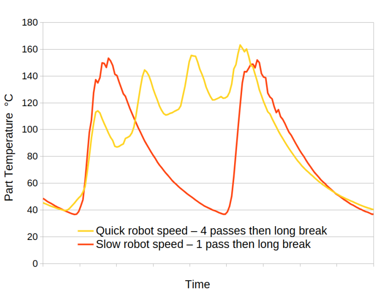Adjusting traverse speed, spray parameters, and feed rate can minimise the heat input per pass. For example, faster traverse speeds reduce the maximum temperature achieved per pass but will require more passes. When combined with intermediate cooling breaks, this approach helps keep the part temperature within an acceptable range.